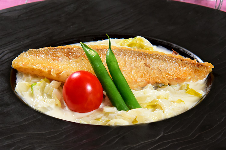 - A)魚料理: 白甘鯛のうろこ焼き 白菜のフリカッセ