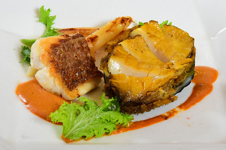 春鯛・鮑のポワレ ホワイトアスパラ 甲殻類のソース
